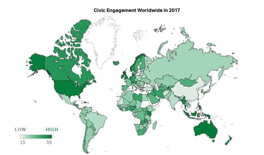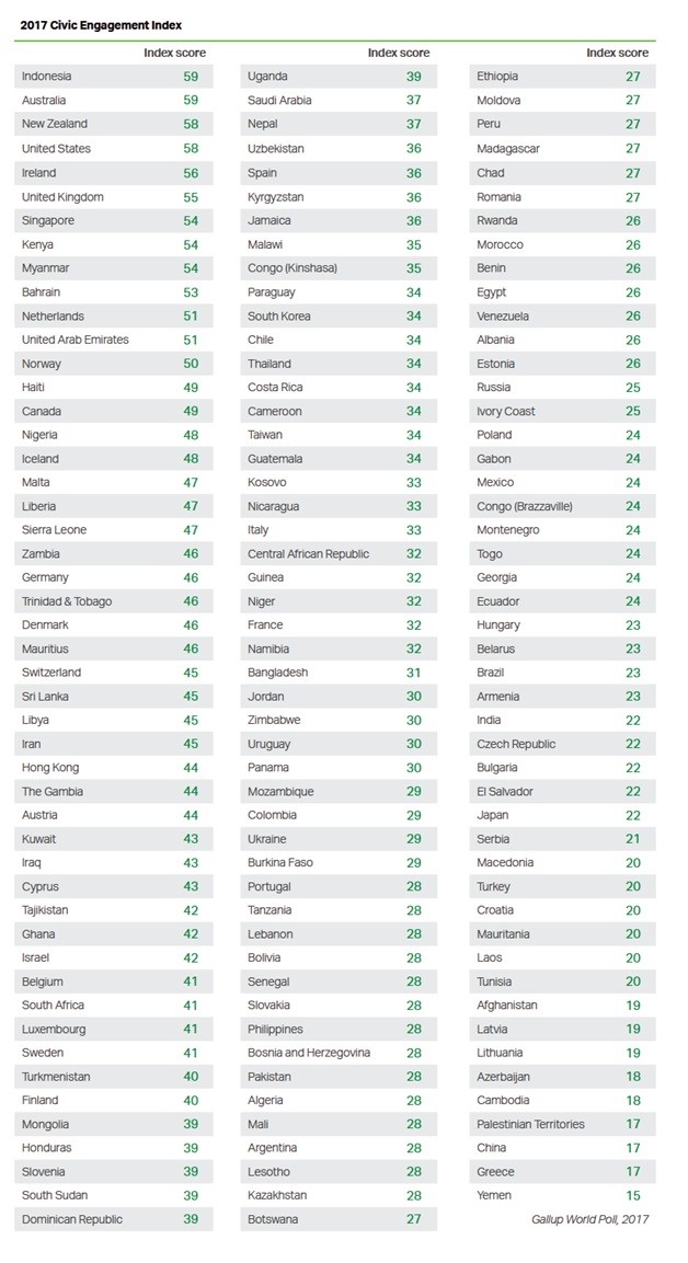 موسسه تحقیقاتی گالوپ هرساله در گزارشی «شاخص تعهد مدنی» (Civic Engagement Score) را برای کشورهای گوناگون منتشر میکند. این شاخص در واقع نوعی شاخص نیکوکاری است و تمایل شهروندان را در سه مورد اندازه میگیرد: پرداخت پول به خیریهها؛ میزان فعالیتهای داوطلبانه و کمک به افراد ناشناس.