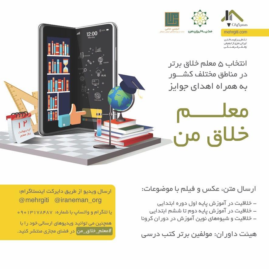 همچنین شما می توانید ویدیوهای ارسالی خود را با هشتک#معلم_خلاق_من در فضای مجازی منتشر کنید. به یکی از ویدیوها که بیشترین بازدید را داشته باشد نیز به انتخاب مردم جایزه تعلق خواهد گرفت.